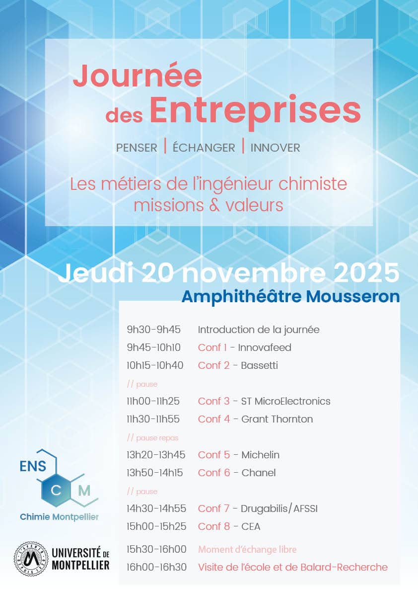 L'ENSCM renouvelle cet événement à destination de ses élèves ingénieurs fain de leur faire connaitre de découvrir le monde d’entreprises invitées. Les représentants des entreprises présentes y présenteront leurs missions (liées à la chimie) et valeurs. Elles expliqueront également les liens qu’elles entretiennent ou souhaitent entretenir avec l’école et ses étudiants (stage, césure, apprentissage, embauche), et ce qu’elles attendent d’eux.